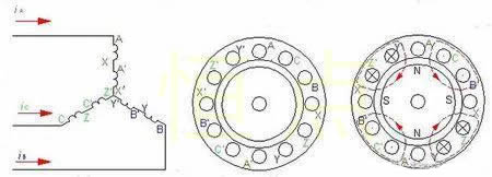 當A、B、C三相每相繞組隻有一個線圈均勻對稱分布在圓周上,則電流變(biàn)化一次,旋轉磁場(chǎng)轉過一圈,這就是一對極。