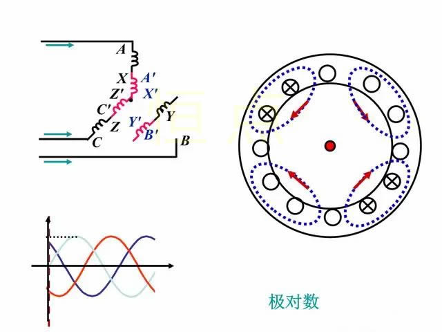 如果A、B、C三相繞組每相分别由兩個線圈串聯組成,每個線圈的跨距爲1/4圓周,那麽三相電流所建立的合成磁場仍然是一個旋轉磁場,並(bìng)且電流變(biàn)化一次,旋轉磁場僅轉過1/2轉,這就是2對極。同理 ,如果将繞組按一定的規則排列 ,可得3對極、4對極或一般地說P對極。P就是極對數。