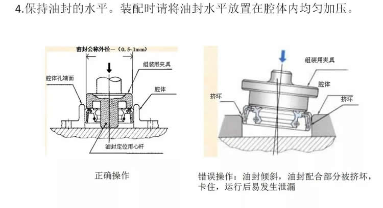 2.油封要平裝,不能有傾斜的現象。建議採(cǎi)用油壓設備(bèi)或套筒工具安裝。壓力不要太大,速度要均勻、要慢。