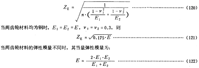 彈性系數ZE是用以考慮材料彈性模量E泊桑比v對赫茲應力的影響 。其數值可按實際的材料彈性模量E和泊桑比v由式(120)計算得出。對於某些常用材料組合的ZE可參考表14查取。