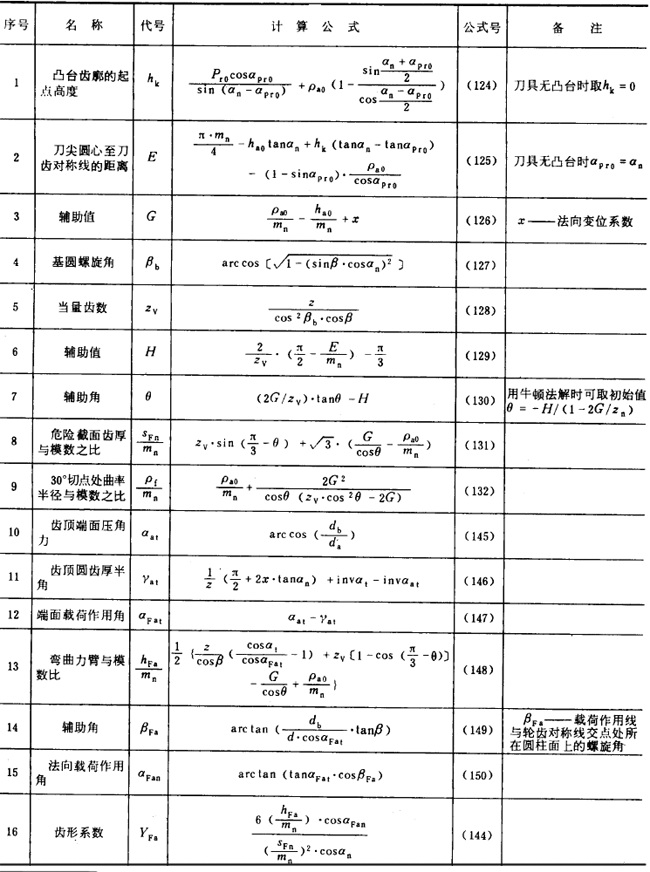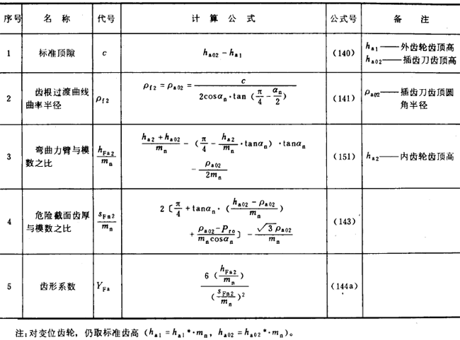 内齒輪的齒形系數YF不僅與齒數和變位系數有關 ,且與插齒刀的參數有關。爲瞭簡化計算,可近似按替代齒條計算(見圖27)。替代齒條的法向齒廓與基本齒條相假,齒高與内齒輪相同 ,法向載荷作用角αFen等於αn,並以腳标2表示内齒輪。有關計算公式見表16(适用於Z2>70)。